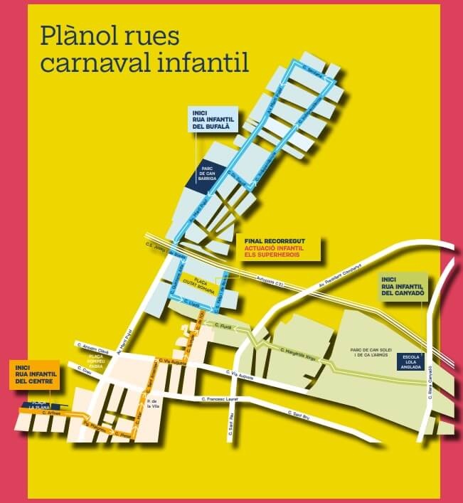Recorrido: Plaça de la Plana, c. Arbres, Plaça Maignon, c. Pietat, c. Mar, Plaça de la Vila, c. Sant Anastasi, c. Via Augusta, c. Temple, c. l'Oli, c. Lladó, c. Sant Felip i de Rosés y Plaça Ciutat Romana.
